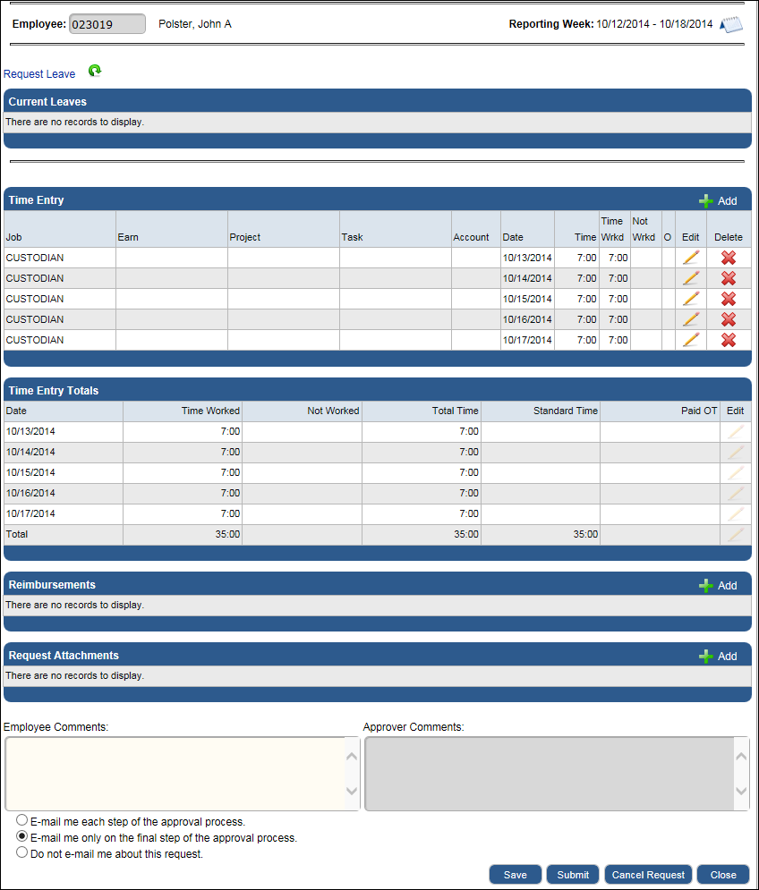 The following figure illustrates the Time Entry Request page that displays when the Time Reporting option assigned to the employee's primary Time Reporting Group is Hours Only. When this option is selected, the employee enters the number of hours worked.